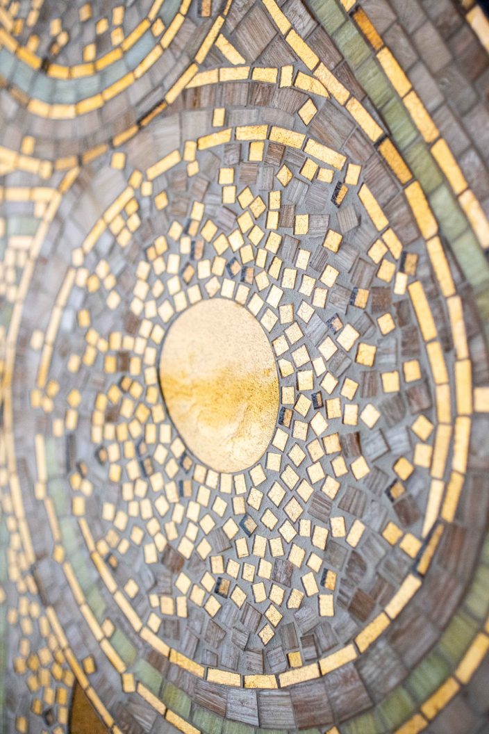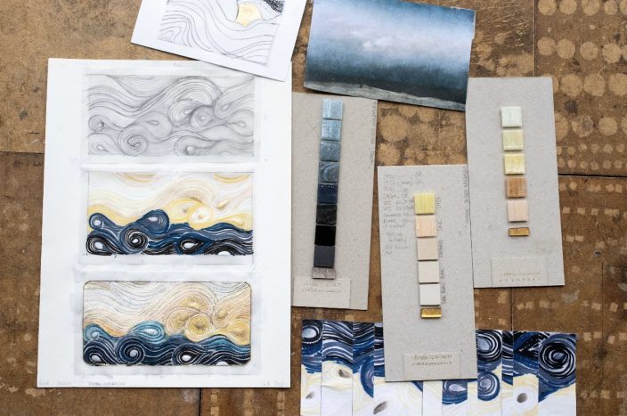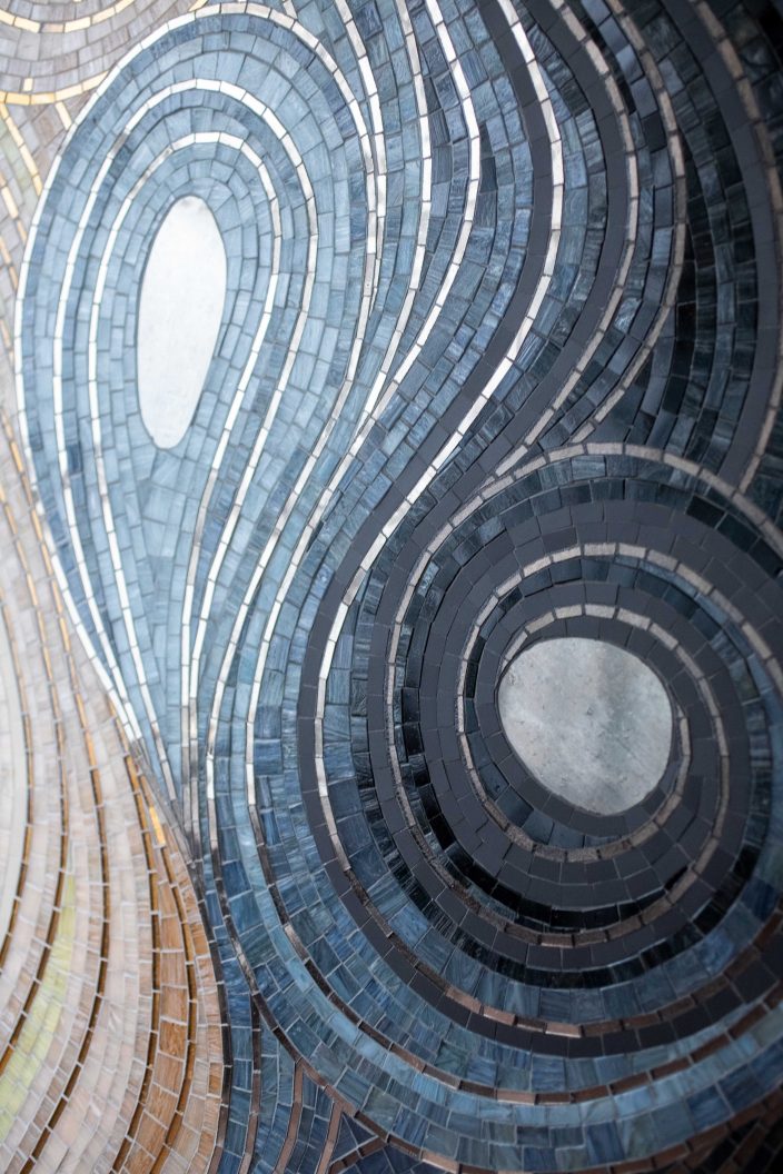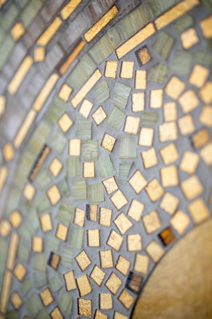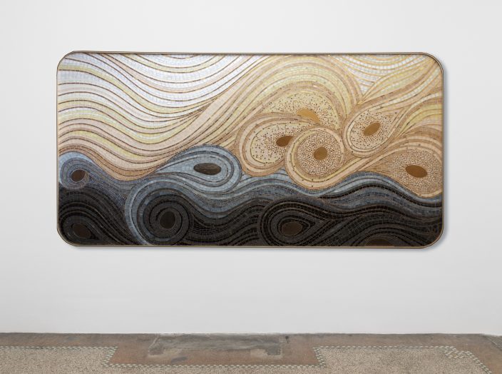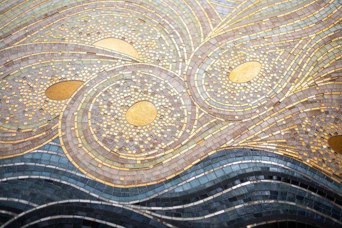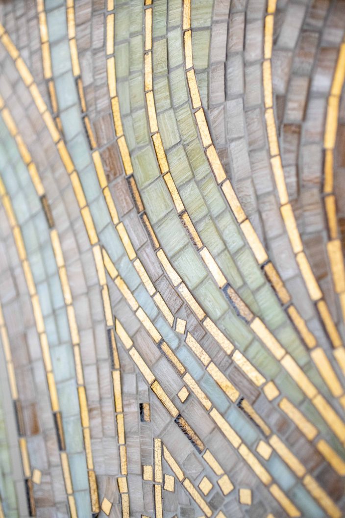Des formes organiques entre un azur aérien et liquide ponctuées par des ovales en platinium ou or jaune pixelisés de petits carrés en tesselles d’or scintillantes, martèlent et transcendent l’œuvre écoulée. Les lignes ondulantes composées de tesselles d’or, de pâte de verre velour, de smalt et de grès cérame contrastent et vibrent en jouant avec la lumière du lieu. Elles accompagnent, modulent et modèlent les centres ovales dans un flux rapide, tendu et deviennent une source d’inspiration vers d’autres horizons.